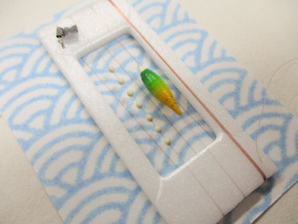 手作りバラタナゴ釣り用 山吹 極小細身浮きシモリ 真ん中通し仕掛け 緑黄ライングラデーション モノスレッドSブラウン使用 板重り ハリス止め付き
